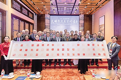 圖為閉幕式上,與會(huì)嘉賓展示書(shū)法版《文明交流互鑒對(duì)話會(huì)北京宣言》。藺紫鷗供圖