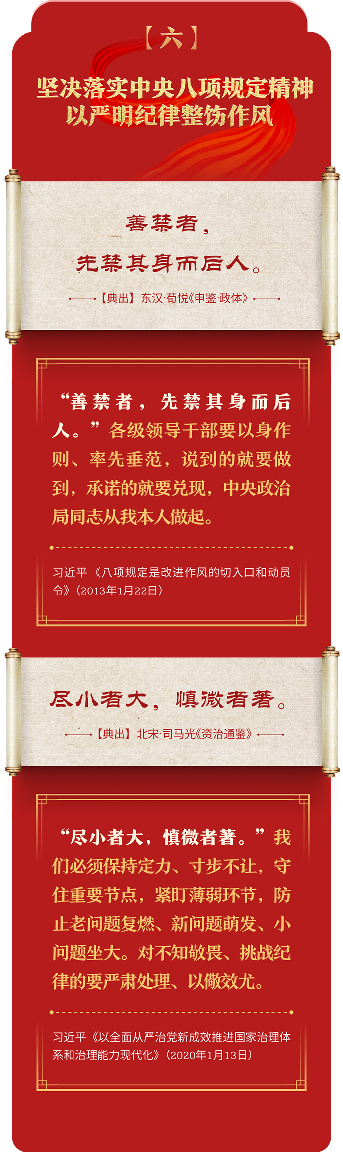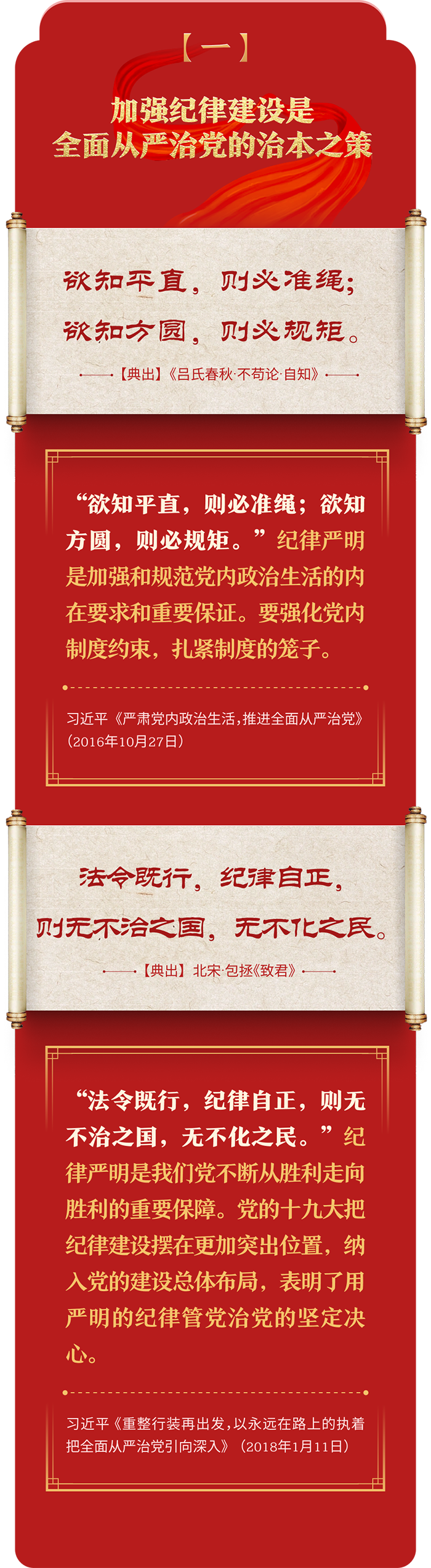 編者按:加強(qiáng)紀(jì)律建設(shè)是全面從嚴(yán)治黨的治本之策。黨的十八大以來(lái),習(xí)近平總書(shū)記圍繞全面加強(qiáng)黨的紀(jì)律建設(shè)發(fā)表一系列重要論述,立意高遠(yuǎn),內(nèi)涵豐富,思想深刻,引導(dǎo)黨員干部學(xué)紀(jì)、知紀(jì)、明紀(jì)、守紀(jì),真正把紀(jì)律規(guī)矩轉(zhuǎn)化為政治自覺(jué)、思想自覺(jué)、行動(dòng)自覺(jué),確保全黨目標(biāo)一致、團(tuán)結(jié)一致、步調(diào)一致。在這些重要論述中,總書(shū)記精妙運(yùn)用古代典籍經(jīng)典名句,以古喻今、啟迪思想、激蕩精神,讓我們一起來(lái)學(xué)習(xí)!